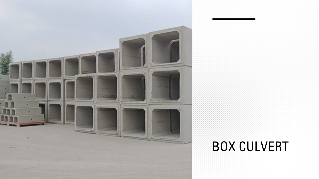 Produk box culvert terbuat dari berbagai material, termasuk beton bertulang, beton pratekan, atau logam. Box culvert di gunakan untuk mengalirkan air dari satu tempat ke tempat lain, mencegah genangan air yang dapat menyebabkan banjir atau kerusakan infrastruktur.